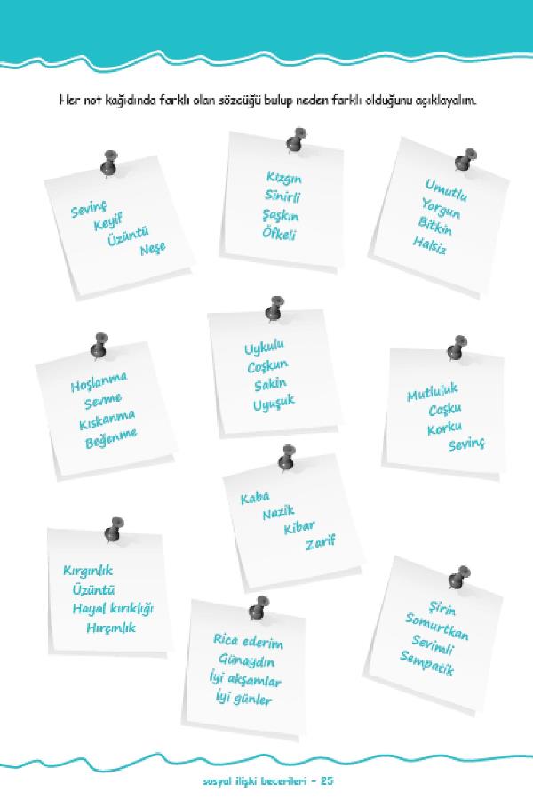 Düşünme Becerileri Dizisi'nin yedinci kitabıdır. Çocuğumuzun kendini ve çevresini tanıma, kendini ifade etme, başkalarının duygularını, düşüncelerini, sözlü-sözsüz, dolaylı-doğrudan iletilerini anlama, karşılıklı kabulü sağlayan toplumsal davranışlar ve kurallarla ilgili farkındalıkları arttırma, sosyal sorunlara çözüm üretebilme becerilerini geliştirmeyi hedefleyen çalışmalardan oluşmuş eğlenceli bir alıştırma kitabıdır.