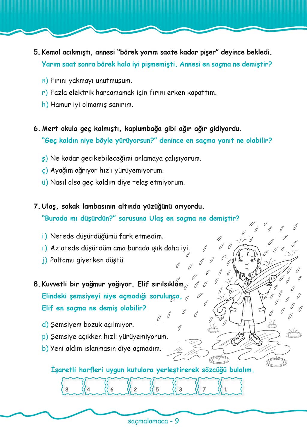Düşünme Becerileri Dizisi’nin dokuzuncu kitabıdır. Çocuğumuzun başta olgu, kişi ve nesne ilişkilerinde uyuşmayanı, yanlışı, beklenmeyeni, olanaksız olanı ayırt etme becerisini geliştirmek amacıyla hazırlanmıştır. Aynı zamanda genel bilgi, düşünme, problem çözme, akıl yürütme, ilişki kurma gibi uslamlama ve dil becerilerini de geliştirecektir. Sorularla, sohbetle yapıldığında oldukça neşeli, eğlenceli bir şekilde uygulanacak keyifli bir eğitim gereci olarak tasarlanmıştır.