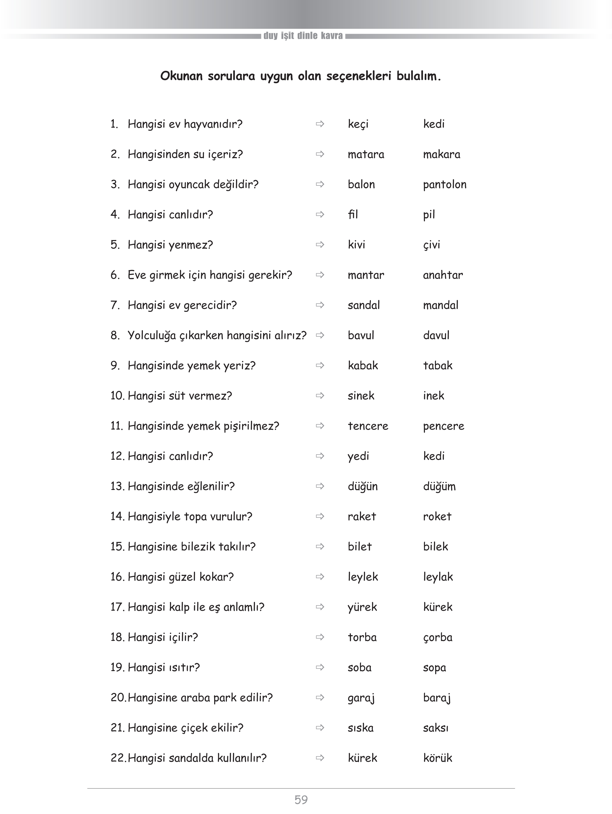 “duy işit dinle kavra” dil becerilerinin yanı sıra pek çok bilişsel alanı da geliştirecek niteliktedir. Okul öncesi yıldan başlayarak her yaşta kullanımı uygundur. Herhangi bir sorunu olmayanlarda normal gelişimi güçlendirmenin yanı sıra, söz konusu alanlarda güçlükler yaşayan çocukların ve belki yetişkinlerin de sorunlarının giderilmesine katkı sağlayacaktır.