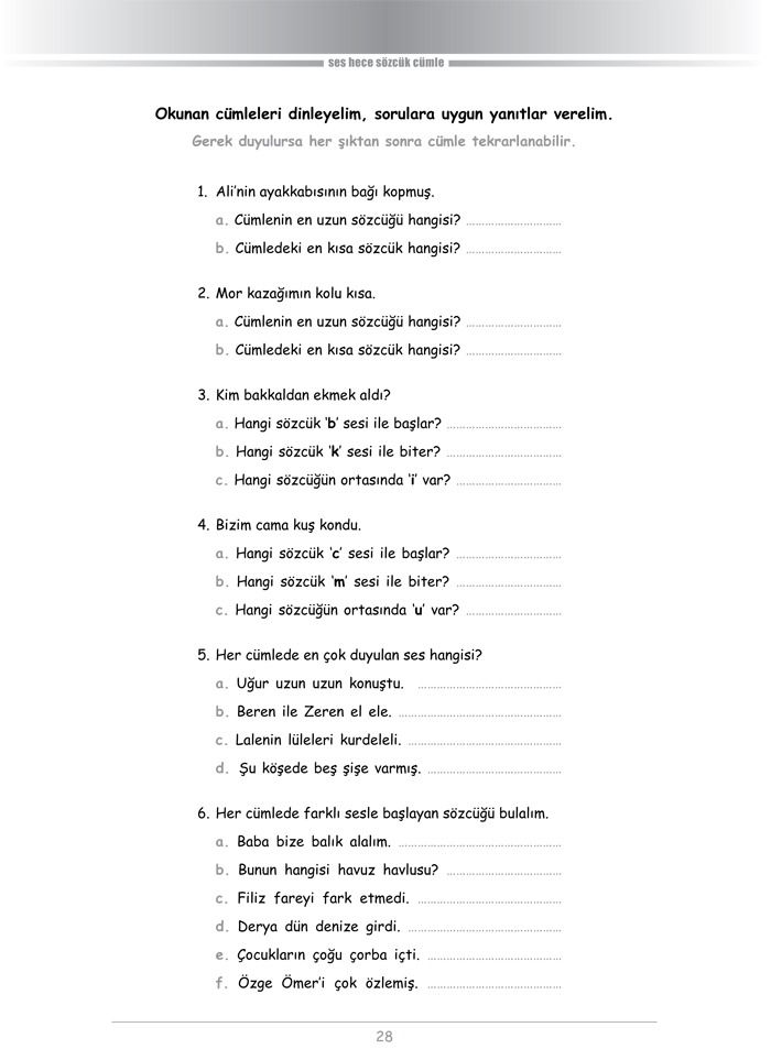 “ses hece sözcük cümle” Dil Becerileri Dizisi’nin ikinci kitabıdır. İşitsel sözel becerileri geliştirmek amacıyla hazırlanmış bir rehber kitaptır. Fonolojik farkındalığı; konuşma seslerini tanımayı, bir sözcüğü oluşturan sesleri ayırt etme yetisini geliştirmeyi, konuşulan ya da yazılı metindeki cümle, sözcük, hece ve sesleri çözümlemeyi, gerektiğinde yeniden harmanlayarak yeni bireşimler oluşturmayı destekleyen alıştırmalardan oluşmuştur.